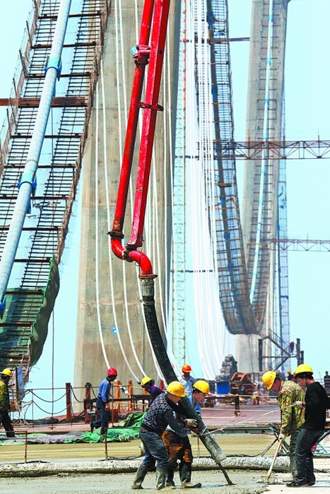 5月2日,建设者在武陟至西峡高速公路跨黄河特大桥上紧张施工。该桥是双塔三跨自锚式悬索桥,其跨度为目前同类型桥梁世界之最。目前,主桥主缆吊杆安装过半,引桥正在紧张进行桥面系施工,6月底将具备桥面沥青混凝土铺装条件。⑤3